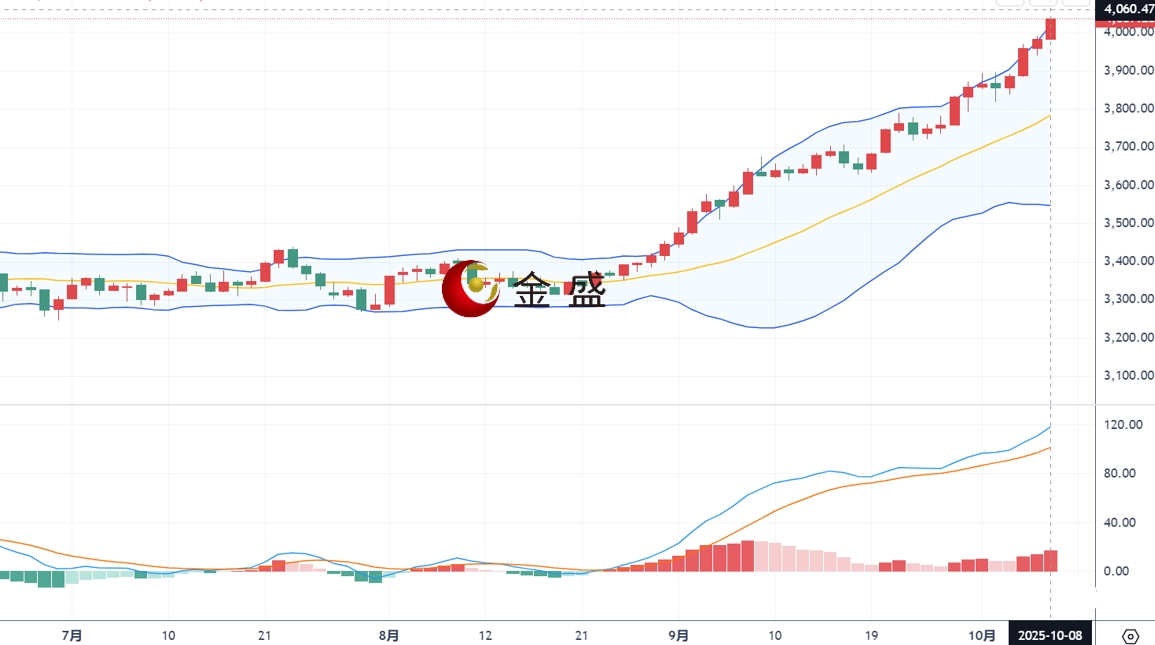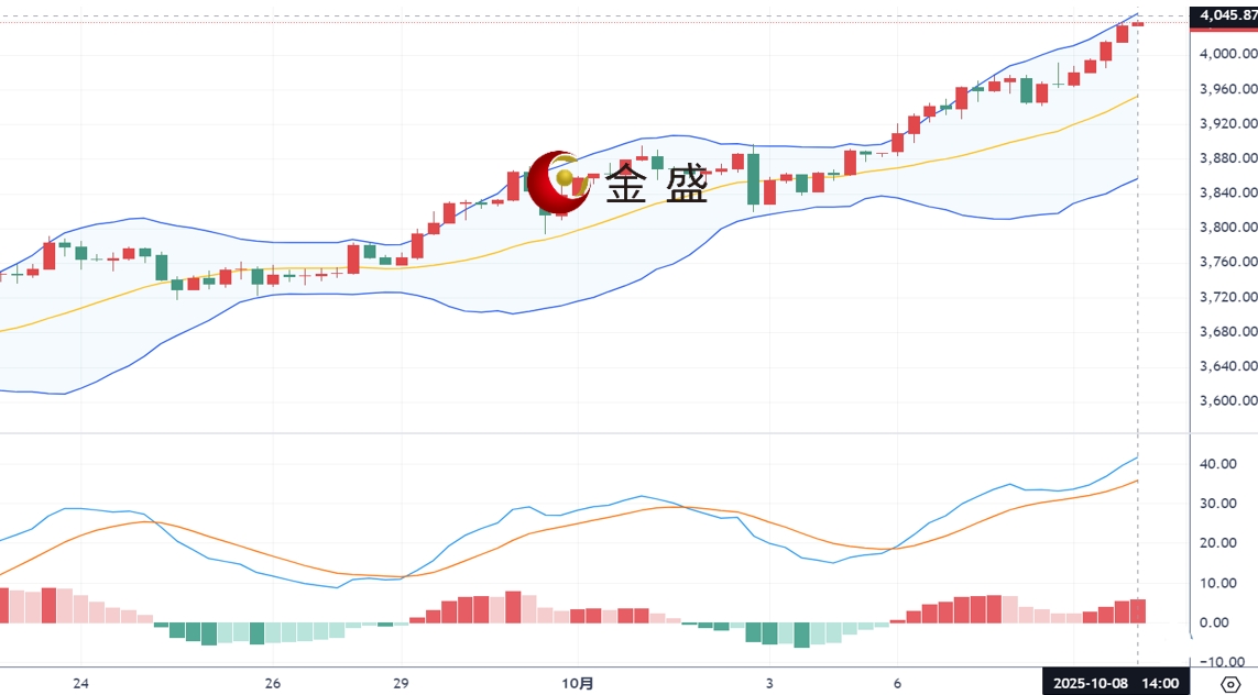从日线图来看,现货黄金上一交易日延续拉升,美盘时段再创新高最高上探3991一线后快速回落,日线以一根下影线很长的中阳线收线。今日开盘黄金仍维持多头动力表现走强,目前一度突破4040美元关口,MACD双线持续金叉,看涨上升运行为主;黄金目前在日线走势上K线继续沿着短周期均线维持着较好的震荡上行走势,布林带开口向上延伸,各均线保持多头排列来看,操作上建议回调做多为主。
