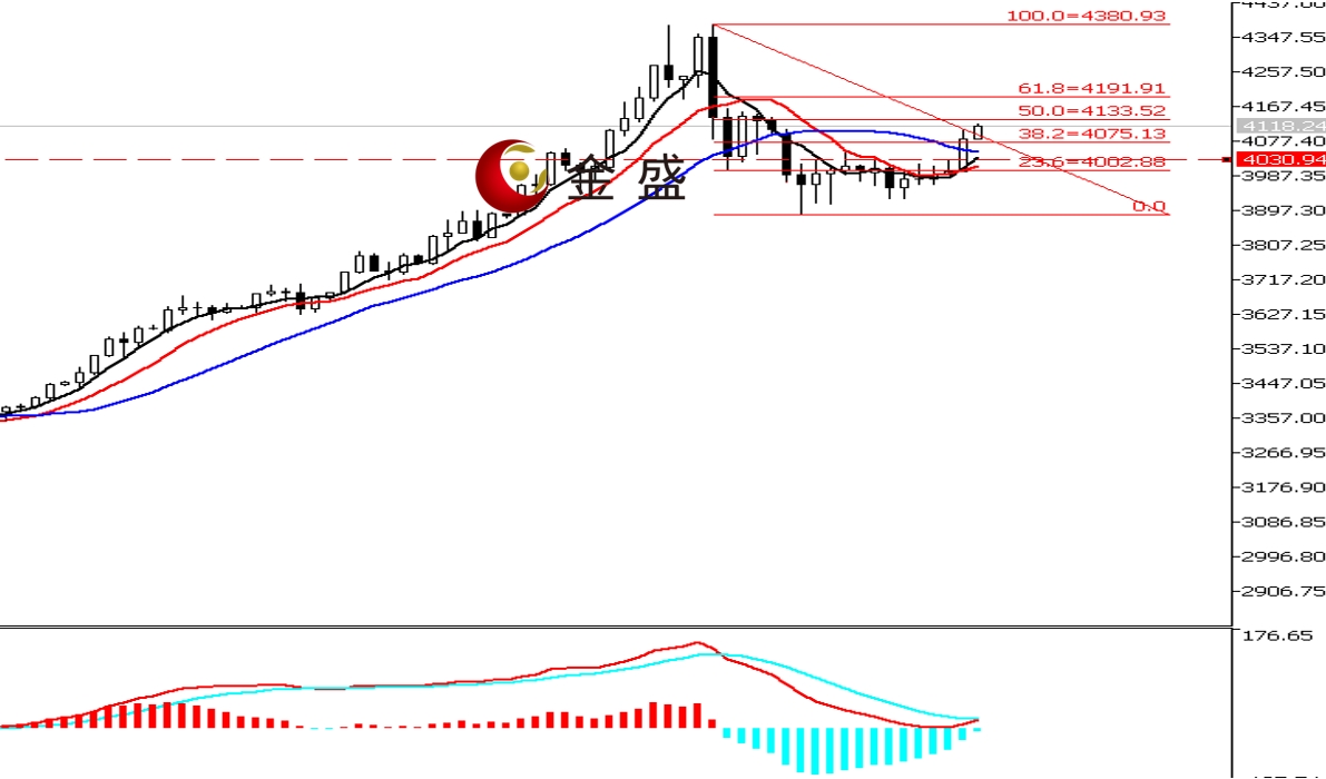 前一个交易日,白盘时段,黄金依托四千关口持续阳线走高,早盘一小时拉升近四十美金,午后日内涨幅逾2%。晚盘时段,多头首次触及4100美元关口有所回调,但随后V型反转,尾盘创当日高点4116.28美元,日图收饱满中大阳线。均线系统收敛向上拐头,运行在价格下方形成支撑。MACD指标快慢线零轴上方有现金叉的迹象,做空的动能减弱。昨日黄金以饱满阳线突破近两周的震荡结构,确认高位第一波调整结束。行情将进入二次探顶的阶段,后市偏向测试4200美元一带的压力,即黄金分割位61.8%附近。短期关注4150美元一带的压力,操作上调整做多为主。