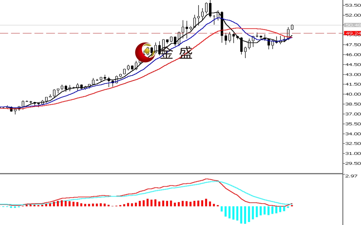 前一个交易日,白盘时段,银价开市创当日低点48.26美元,早盘一小时拉升近2%,价格站上49美元大关。午后突破上周盘整结构连阳上行。晚盘时段,行情承压50美元一带有所休整,尾盘继续上涨,价格最高至50.56美元,日图收中大阳线。均线系统收敛向上拐头,对价格反弹形成支撑。MACD指标快慢线零轴上方现金叉,做多的动能有增强的迹象。白银低位盘整形成头肩底结构,昨日强势突破颈线压力,确认反转形态成立。后市关注51美元一带的压力,操作上低吸为主。