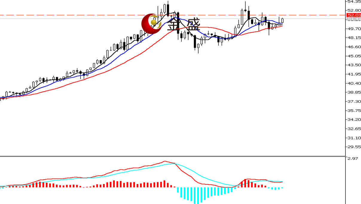 前一个交易日,白盘时段,行情依托51美元关口震荡为主,价格创日内高点51.71美元。晚盘时段,美国经济数据利多金银,但银价承压早盘高点跳水,一小时下挫近2%,创当日低点50.64美元,尾盘收复全部跌幅,最终收十字星。均线系统不断收敛,对价格反弹形成支撑。MACD指标快慢线零轴上方现死叉,做空的动能减弱。白银周一大涨形成止跌信号,昨日横盘震荡为主,盘中调整空间有限,可见多头获利了结意愿不强。短期看反弹的持续性,52美元一带形成强压区。