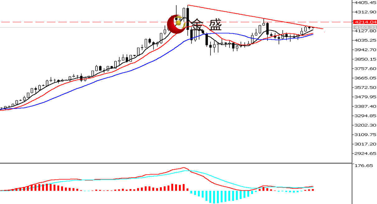 前一个交易日,白盘时段,黄金开市即创当日高点4168.5美元,早盘震荡下行,创日内低点4142.59美元。欧美盘时段,行情以震荡为主,但价格重心有所上移,即区间内震荡偏强,最终收十字星。均线系统逐渐向上拐头,运行在价格下方形成支撑。MACD指标快慢线零轴附近现金叉,做多的动能增强。黄金构成收敛三角形结构。价格在结构上轨横盘两天,但K线承压信号不明显,而震荡低点却逐步上移,可见蓄势向上变盘的概率较大,后市看4200美元上方的压力。