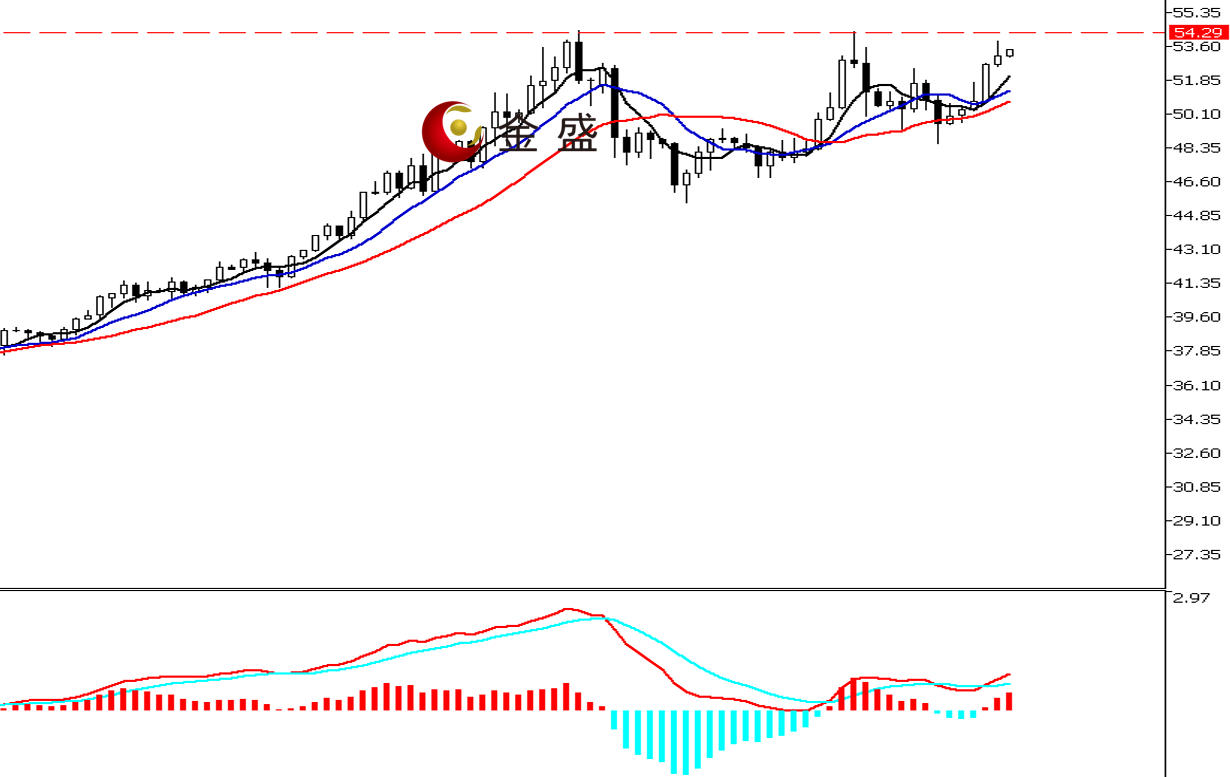 前一个交易日,白盘时段,银价技术性调整,跌破53美元关口,创日内低点52.65美元。午后走V型反转,价格创当日高点53.87美元。晚盘时段,市场流动性不足,行情围绕53美元关口横盘休整,最终收十字星。均线系统收敛向上拐头,对价格反弹形成支撑。MACD指标快慢线零轴上方现金叉,做多的动能增强。白银周内持续创高点,K线结构上涨—休整—上涨稳步爬升,技术形态是茶杯结构,属于看涨结构,后市看前高的真假破位,操作上调整做多为主。