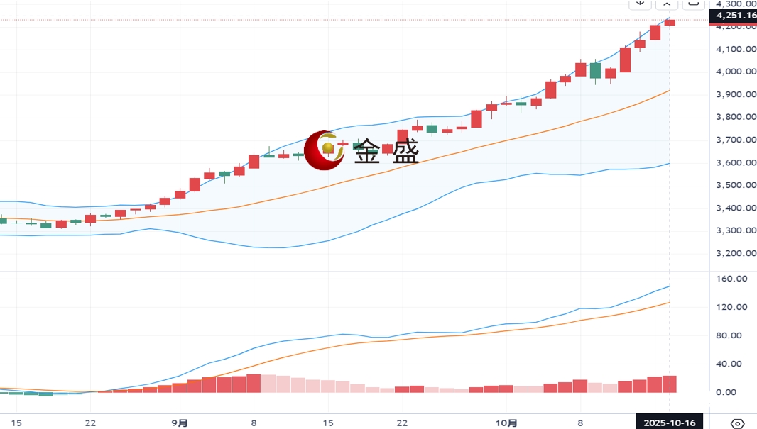 现货黄金周四(10月16日)开市于4208.70美元/盎司,盘中再创历史新高至4041.77美元/盎司,连续第五日上涨,受到中美贸易紧张局势升级、美国政府停摆风险以及美联储降息预期升温的影响,投资者纷纷转向黄金避险。金价今年以来已经飙升61%。