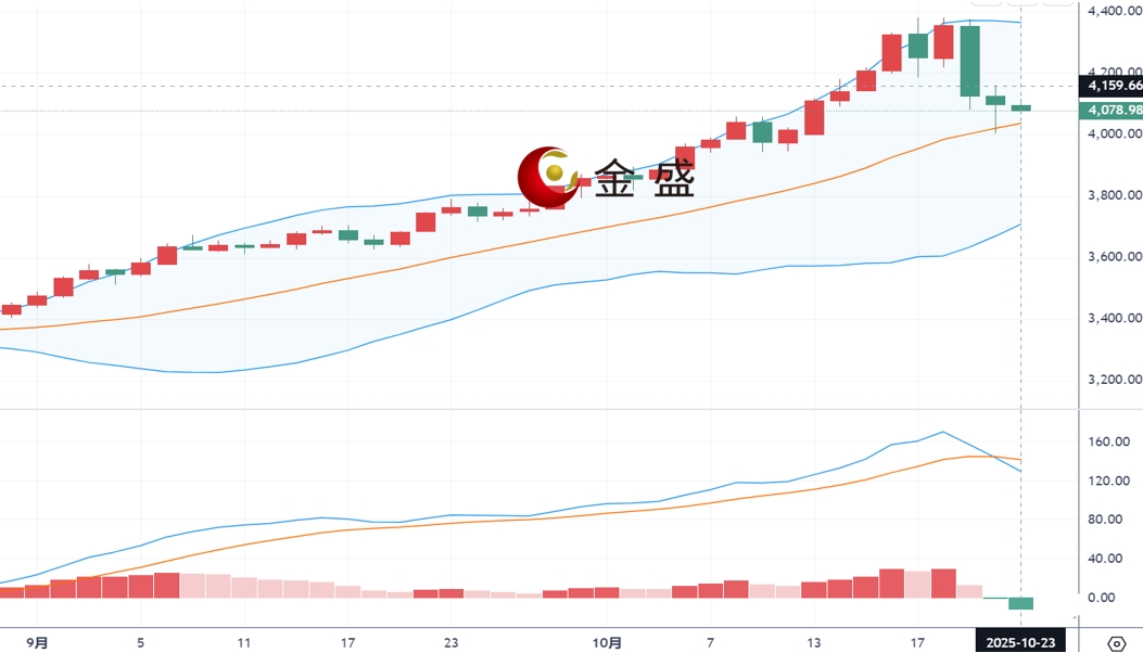 现货黄金周三(10月22日)亚市早间开盘于4125.52美元/盎司,最高4161.50美元/盎司,最低4004.06美元/盎司,收盘4098.35美元/盎司,全天波幅约157美金,当日跌幅约0.64%。