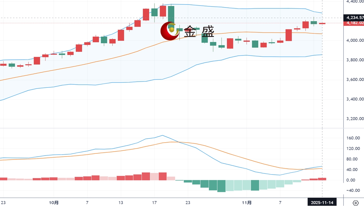 现货黄金隔日从盘初触及的三周高点回落,回吐了美国政府重开后可能提振降息预期的早期涨幅。因市场预期政府重开后将公布显示劳动力市场疲软的经济数据,可能推动美联储12月降息。然而,随着美联储决策者近期接连表达对进一步降息的谨慎态度,市场情绪迅速转向。截至目前,现货黄金窄幅震荡,最高触及4210.63美元/盎司,最低至4145.25美元/盎司。