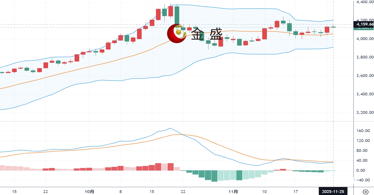 从四小时图来看,现货黄金上一交易日早盘测试4040一线后持续震荡走高,在凌晨时段冲高并冲破4100-4110一下震荡区间阻力,随即再度冲破4130的上周高点,当前黄金处于高位整理,价格运行在布林带中轨上方,今日黄金早盘自4122一线拉高并破高,MACD动能柱由空转多,快慢线向上发散,短期技术结构偏向多头延续,但需警惕回撤风险,上方关注4160-4170区间阻力,下方关注4100-4090区间支撑。