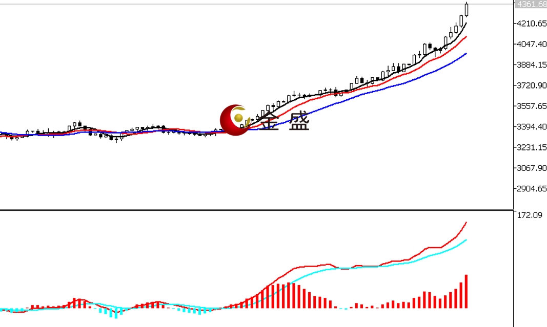 前一个交易日,白盘时段,黄金依托4200美元关口震荡上行,午后短暂回吐早盘全部涨幅。晚盘时段,行情一波单边大涨逾一百美金,价格强势突破4300美元大关,尾盘创当日高点4330.25美元,日图收饱满中大阳线。均线系统多头排列,运行在价格下方形成支撑。MACD指标快慢线零轴上方现金叉,做多的动能为主。黄金上行趋势不变,昨日突破4300美元大关。今天早盘继续拉升逼近4400美元一带。行情进入加速上行阶段,价格出现严重超买现象,谨防拉高跳水走势。操作上调整做多为主。