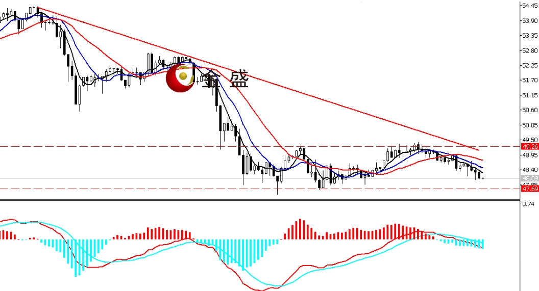 前一个交易日,白银走势与黄金同步,价格震荡上行至49美元一带,最终收涨0.86%。今天白盘行情持续下行,午后加速跌破48美元大关。小时周期,均线系统空头排列,对价格反弹形成压制。MACD指标快慢线零轴附近现死叉,做空的动能增强。白银进入调整周期,周内的回调形成图示的趋势线,价格运行在其下方。近两日的价格走势形成47.7—49.2的箱体结构,短期关注区间下轨的真假破位。下轨附近出现止跌信号,尝试博弈多单。