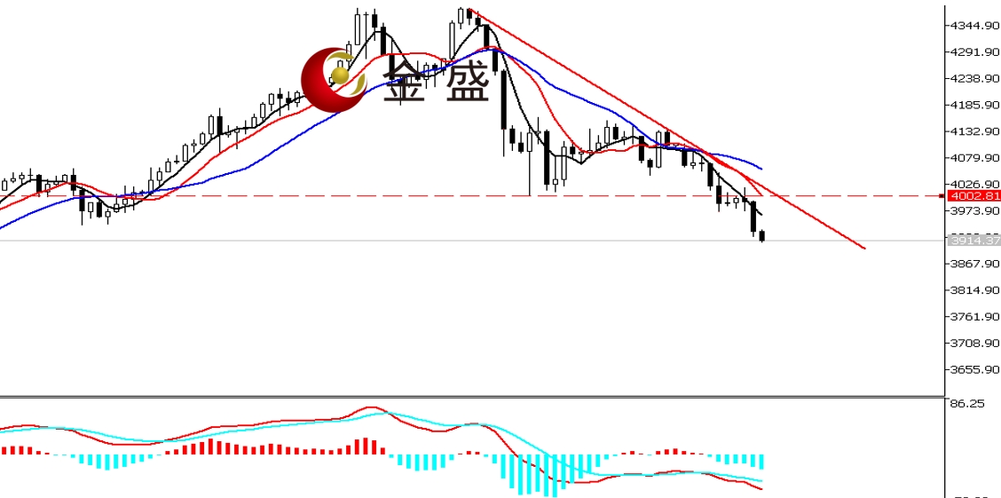 前一个交易日,美指继续承压99美元一带震荡收小阴。因贸易冲突缓和,市场避险需求降温。黄金低开低走,晚盘加速跌破四千关口,当日波动逾一百三十美金,最终大跌近3%。今天白盘行情围绕四千关口休整数小时,午后延续下行,价格逼近3900美元一带。四小时周期,均线系统空头排列,对价格反弹形成阻碍。MACD指标快慢线零轴下方现死叉,做空的动能为主。黄金上周的震荡形成圆弧顶结构,价格跌破四千关口加速走低。根据最小目标原则,后市目标偏向测试3850美元一带,此处也是自3310美元开始形成九连阳上涨波段的50%附近。短期关注3900美元一带的得失,操作上等待止跌企稳博反弹。