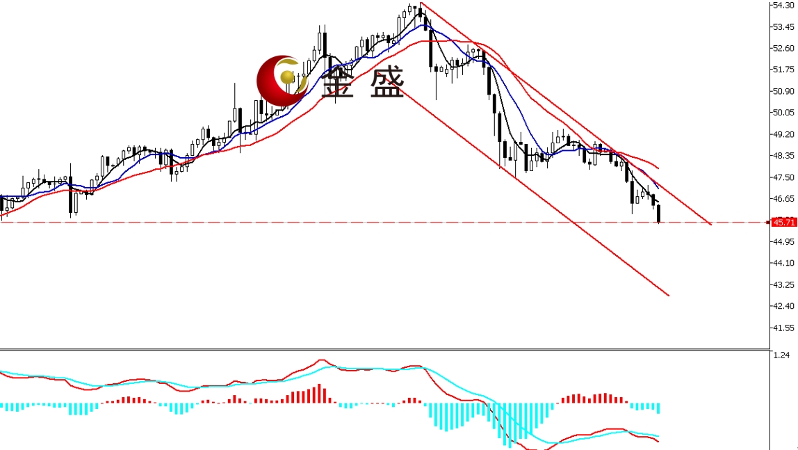 前一个交易日,白银走势与黄金同步,行情低开低走,盘中反弹力度乏力,午后打破上周整理低点,晚盘加速下挫,最终收跌3.54%。今天白盘行情继续下跌,午后刷新昨日低点,价格跌破46美元大关。四小时周期,均线系统收敛向下拐头,对价格反弹形成压制。MACD指标快慢线零轴下方现死叉,做空的动能增强。白银进入调整周期,走势形成下行通道。目前价格来到周图的十周期均线,也是图示水平支撑45.7美元一带,短期关注此处能否止跌企稳。日内跌幅偏大,不宜追空。