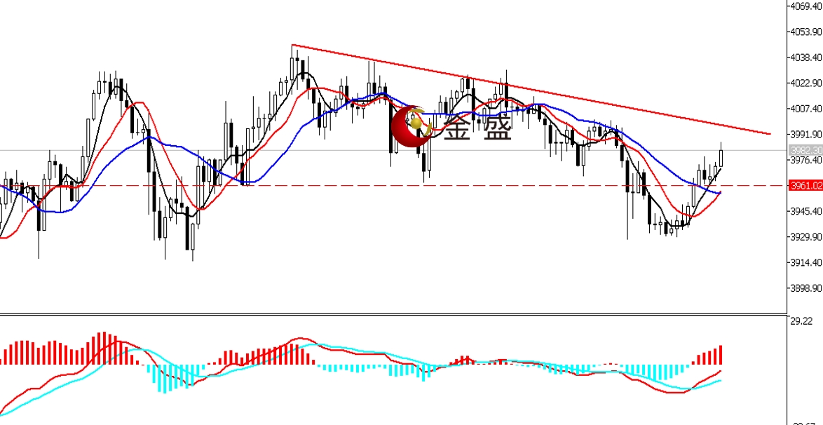 前一个交易日,美指延续涨势,并上破百元关口,日图形成五连阳。黄金承压四千关口震荡下行,晚盘加速下挫至3930美元一带,最终收跌1.71%。今天白盘行情持续反扑,多头收复昨日大部分跌幅。小时周期,均线系统收敛向上拐头,运行在价格下方形成支撑。MACD指标快慢线零轴下方现金叉,做多的动能为主。昨日黄金跌破下降三角形结构收阴,形态下轨3960一带按理是压力位,但今天重新进入结构内,可能意味着走势下行乏力。行情近期盘整的低点依然在抬升,维持区间震荡偏强的状态。今天如收盘于3970美元上方,则后市偏向震荡上行。
