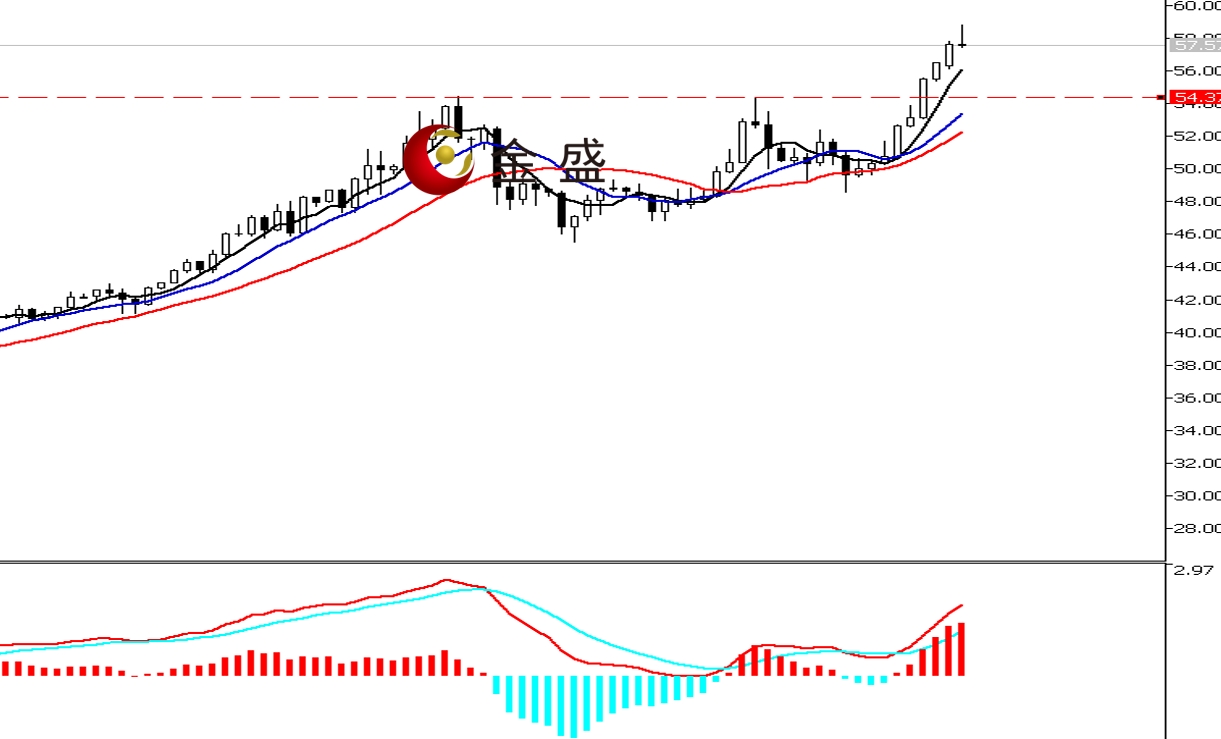前一个交易日,白盘时段,银价依托56美元附近的支撑延续上行,早盘多头快速突破57美元大关,价格最高至57.81美元。欧美盘时段,行情以横盘震荡为主,最终收阳线。行情均线系统收敛向上拐头,对价格上行形成支撑。MACD指标快慢线零轴上方现金叉,做多的动能增强。白银连续多日收阳,价格持续新高,但指标未同步创新高,这是多头预警信号,即不宜追涨,操作上调整做多为主。