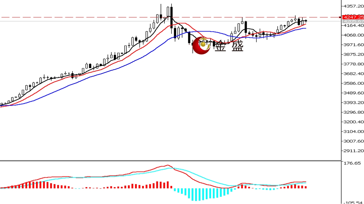 前一个交易日,早盘时段,白银开市即创日内低点57.06美元,随后连阳上行突破周二高点。午盘价格一小时下挫逾一美金,但多头很快收复全部失地。晚盘时段,行情先涨后调,价格上冲至59美元附近有所回落,最终收阳线。行情均线系统多头排列,短期对价格上行形成支撑。MACD指标快慢线零轴上方现金叉,做多的动能增强。近两日白银形成阳包阴结构,弱化周二的空头势能。行情高位震荡,总体向上趋势不变,但盘中多次出现跳水现象,即在高位多头有获利了结的嫌疑,故而操作上调整做多为主。