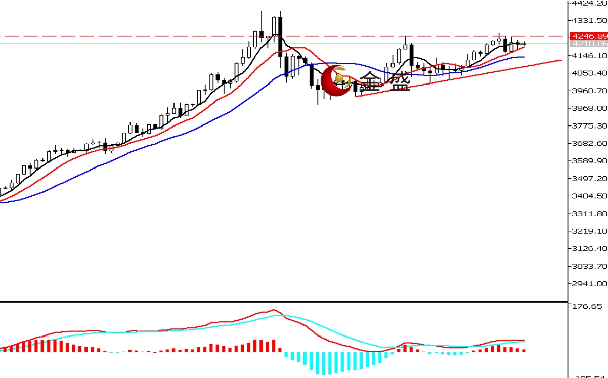 前一个交易日,早盘时段,黄金开市一小时波动近三十美金,创当日高点4224.96美元,随后震荡下行跌破4200美元大关,盘中最低至4175.07美元。欧美盘时段,行情以反弹为主,多头收复日内大部分跌幅,价格重返4200美元上方,日图收有下影线的小阴线。均线系统逐渐向上拐头,运行在价格下方形成支撑。MACD指标快慢线零轴附近现金叉,做多的动能减弱。昨日黄金回踩十周期均线有反扑,全天走类似V型结构,再次确认4200美元下方支撑有效。行情在压力位休整多日,但一直未打开下行空间,可见空头力度不足,操作上调整做多为主。