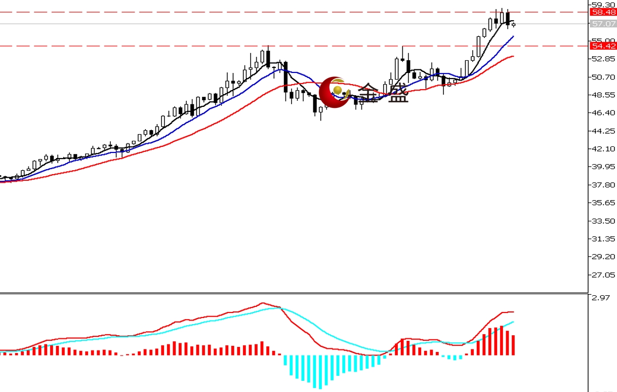前一个交易日,早盘时段,白银承压58.8美元一带横盘数小时,午后向下变盘持续下挫,多头接连失守58、57美元大关。晚盘时段,行情跌势减缓,价格横盘震荡为主,盘中最低至56.44美元,最终收阴线。行情均线系统多头排列,价格刺破五周期均线。MACD指标快慢线零轴上方现金叉,做多的动能为主。白银承压59美元附近横盘整理,价格走势构成箱体结构。近两日形成阴包阳的调整信号,短期关注区间下轨56.5美元一带的得失。一旦失守,则偏向调整加大,操作上回落做多为主。